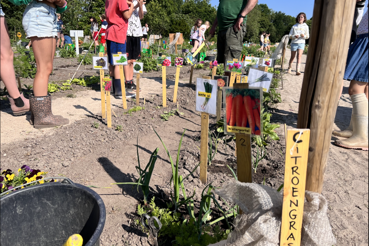 “Juf, mag ik mijn schoenen uit?” – Als de zon schijnt is het natuurlijk verleidelijk om lekker op blote voeten door de moestuintjes te banjeren. Maar het antwoord is toch “NEE”. In de schooltuin werken kinderen met scherp gereedschap. Alhoewel ze leren hoe ze dat moeten opbergen slingert er toch weleens een hakje, schepje of harkje rond. Stevige schoenen of laarzen beschermen de voeten. Dus, in de moestuin geldt: Schoenen (of laarzen) altijd AAN.